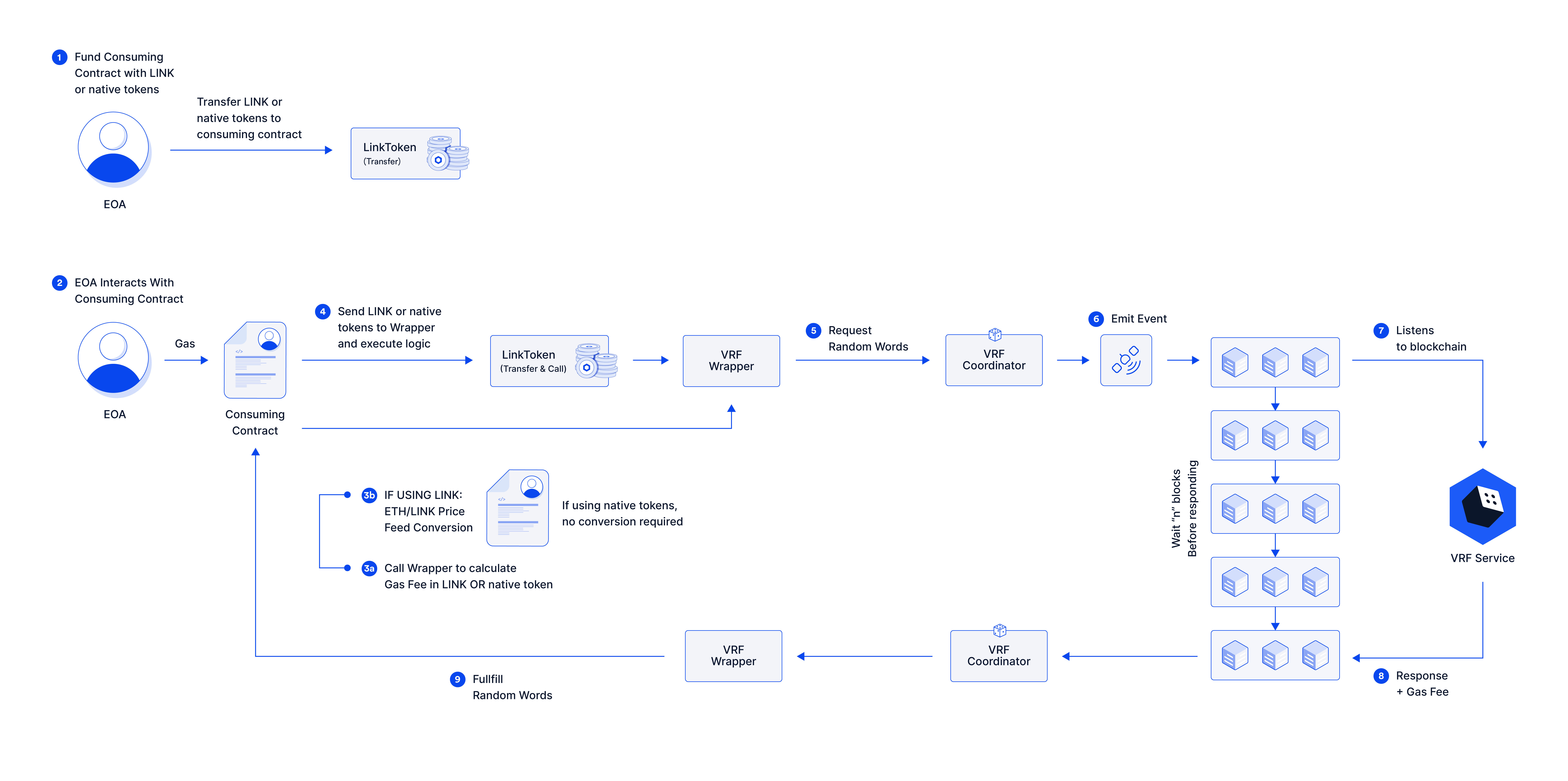 • VRF service (offchain component): Listens for requests by subscribing to the VRF Coordinator event logs and calculates a random number based on the block hash and nonce. The VRF service then sends a transaction to the VRFCoordinator including the random number and a proof of how it was generated.